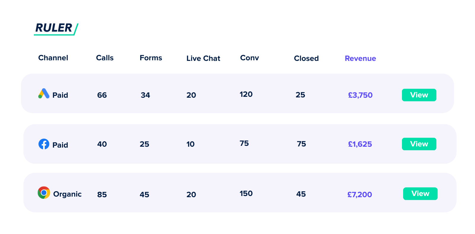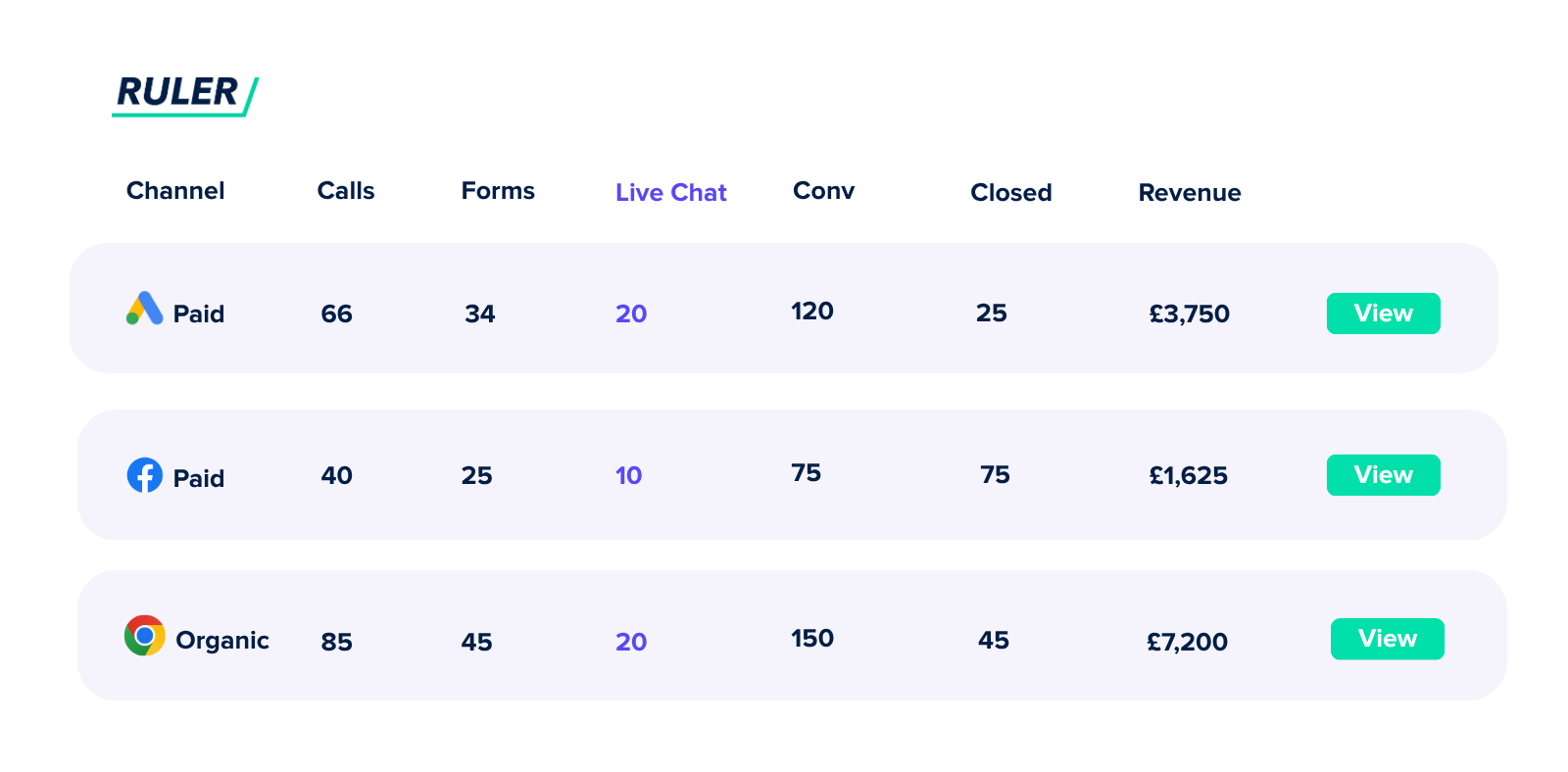 Ruler bridges the data gap for companies using live chat to drive website users down their customer journey. Track every conversation, understand how marketing influences live chat and track how much revenue it brings in.