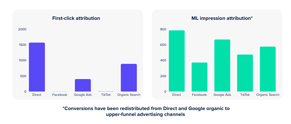 It uses MMM to assign fair weightings to impression-heavy campaigns that traditional attribution overlooks, like paid social or display.