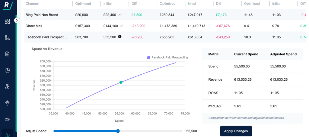 Using these insights, Ruler’s Budget Optimiser recommends the optimal allocation of spend across channels, helping teams maximise ROI while avoiding wasted budget.