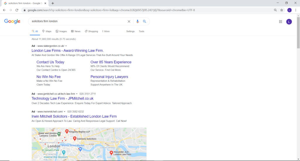 For example, ‘solicitors firm London’, will highlight the map over web pages and blogs. But, PPC ads will always sit above the map result. Even on mobile.
