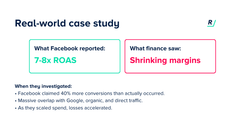 The company was scaling Facebook advertising based on strong in-platform ROAS numbers showing 7-8x returns. But when the finance team looked at actual bottom-line profitability, the math didn’t add up. They were spending more on Facebook but profit margins were actually shrinking.