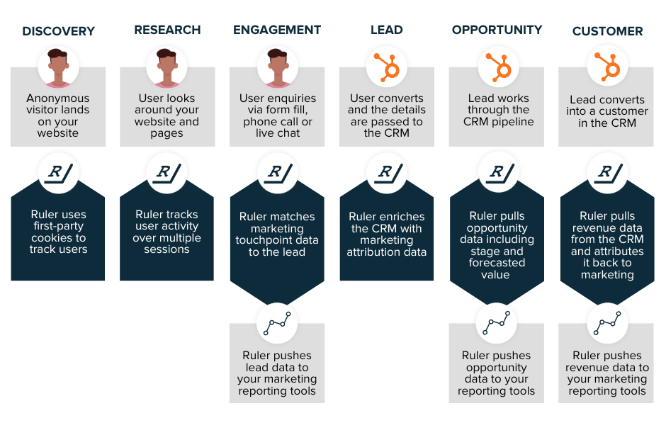 Ruler gathers and distributes the conversion and marketing attribution data, sending the information to your HubSpot CRM.